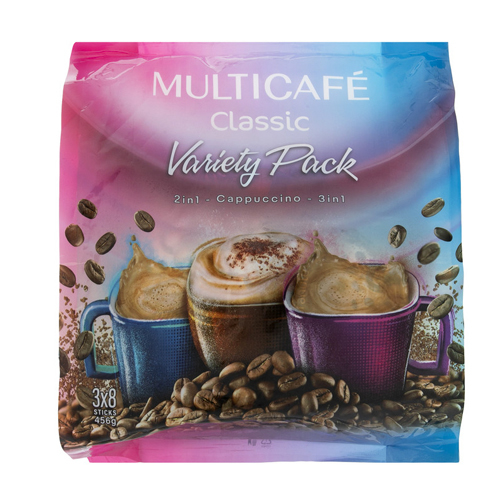 - این بسته شامل کاپوچینو همراه پودر کاکائو - پودر قهوه ۲ در ۱ - پودر قهوه ۳ در ۱ ارزش غذایی ۲.۳ لیوان کاپوچینو ۱۵۰ میلی لیتر : انرژی : ۱۰۷ کیلوکالری قند : ۱۵ گرم چربی : ۲.۳ گرم نمک : ۰.۲۱ گرم اسیدهای چرب ترانس : ۰ گرم - محصولات خوشمزه مولتی کافه کلاسیک در بسته متنوع جمع شده اند. با خرید این بسته کافی میکس ۳در۱ ، ۲در۱ و کاپوچینو مولتی کافه کلاسیک را داشته باشید. از هر محصول ۸ عدد در این بسته قرار داده شده است. - یک بسته کافی میکس را در یک فنجان با آب داغ حل نموده و میل نمائید. - فوری بسته ترکیبی شامل ۳ محصول
